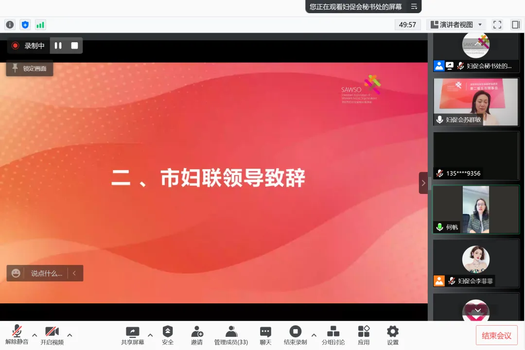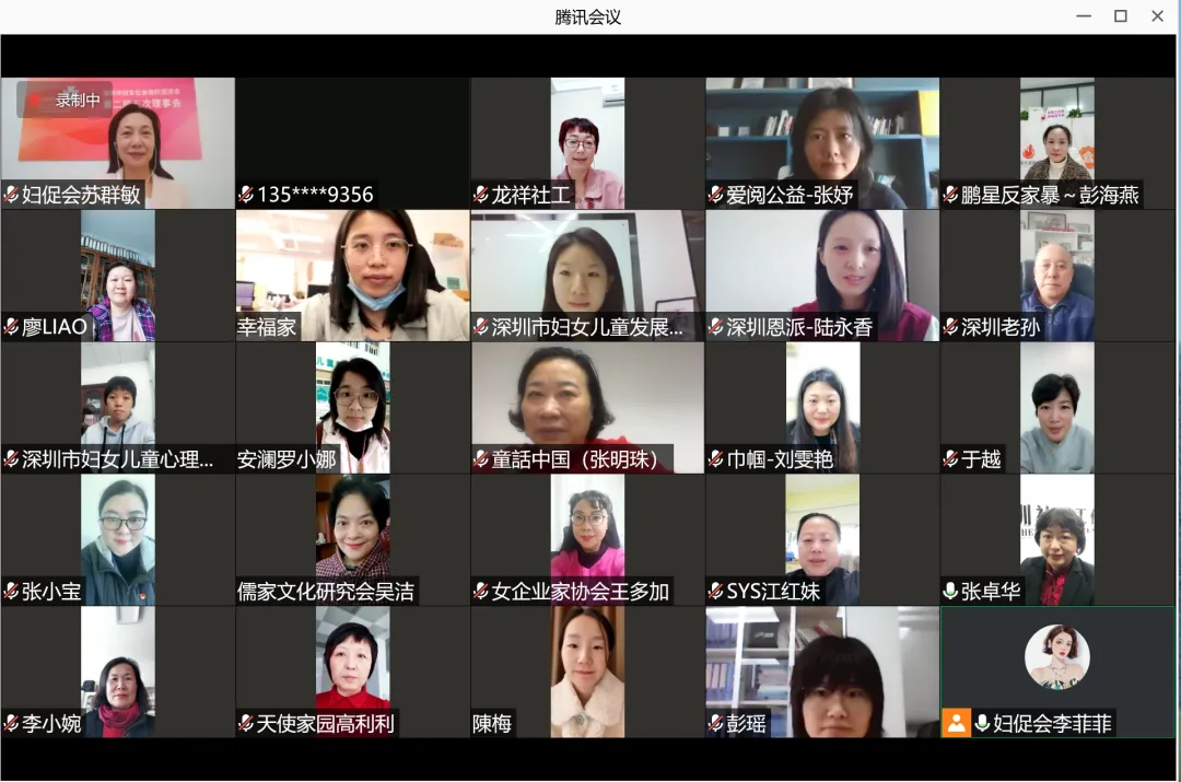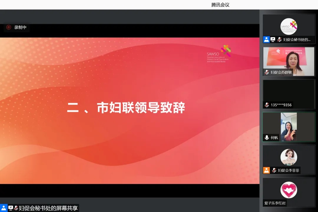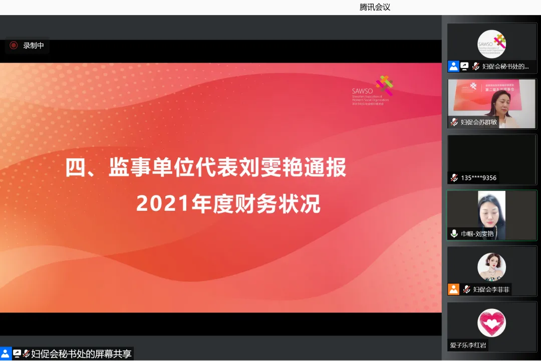 深圳市妇女社会组织促进会第二届五次理事会于2022年1月19日上午顺利召开!因疫情防控要求,本次会议采用线上会议形式开展,共计27位理事(代表)及1位监事参会,深圳市妇女联合会副主席彭迎九女士、深圳市妇女联合会家儿部副部长何帆女士出席了此次会议。会议由妇促会会长苏群敏、秘书长张伟联合主持。