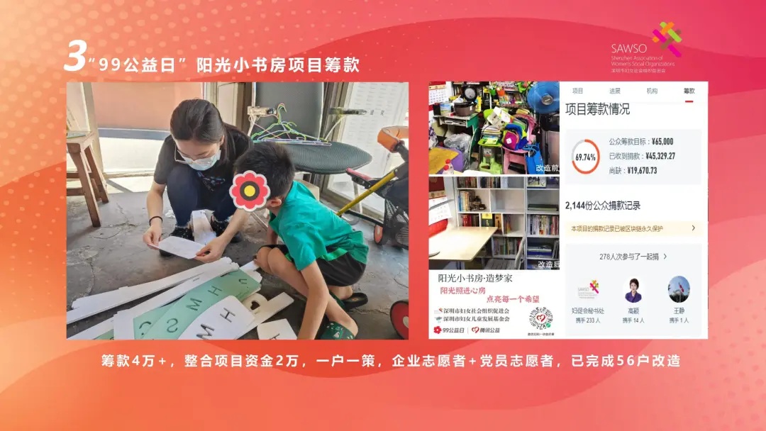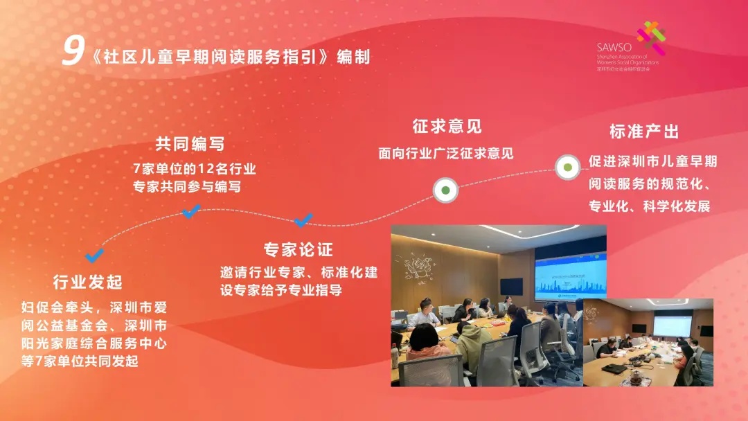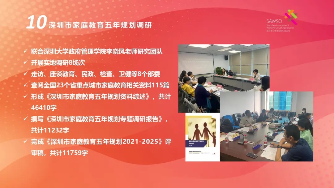 另外,也从加强党建经费统筹,培育支持特色党建项目、迎接社会组织评估,保障机构有序高效运作、以人才库为依托,培育家庭教育专业人才(公益伙伴、家庭社工培训)、以项目库为载体,推动社会组织业务发展(福田、南山、光明、龙华)等8个方面对2022年度工作计划进行了汇报。