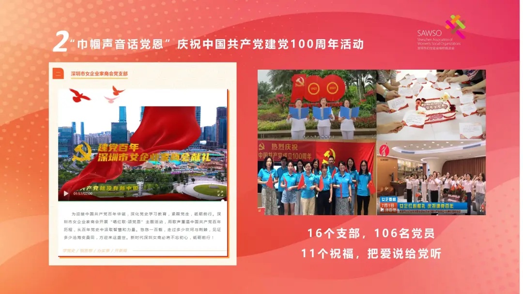 张伟秘书长汇报了2021年工作总结及2022年工作计划,以事件讲述的形式分别从筹备、成立专业委员会,“巾帼声音话党恩”庆祝中国共产党建党100周年活动,“99公益日”阳光小书房项目筹款,深圳市家庭社会工作人才培训班,第九届慈展会,“社会协同,助力家庭”深圳市妇女社会组织家庭研讨会,阳光儿童家庭服务项目总结会,2021年深圳市妇女儿童家庭服务项目建设,《社区儿童早期阅读服务指引》编制,深圳市家庭教育五年规划调研这十大事件,概括总结了2021年妇促会整体工作成效。