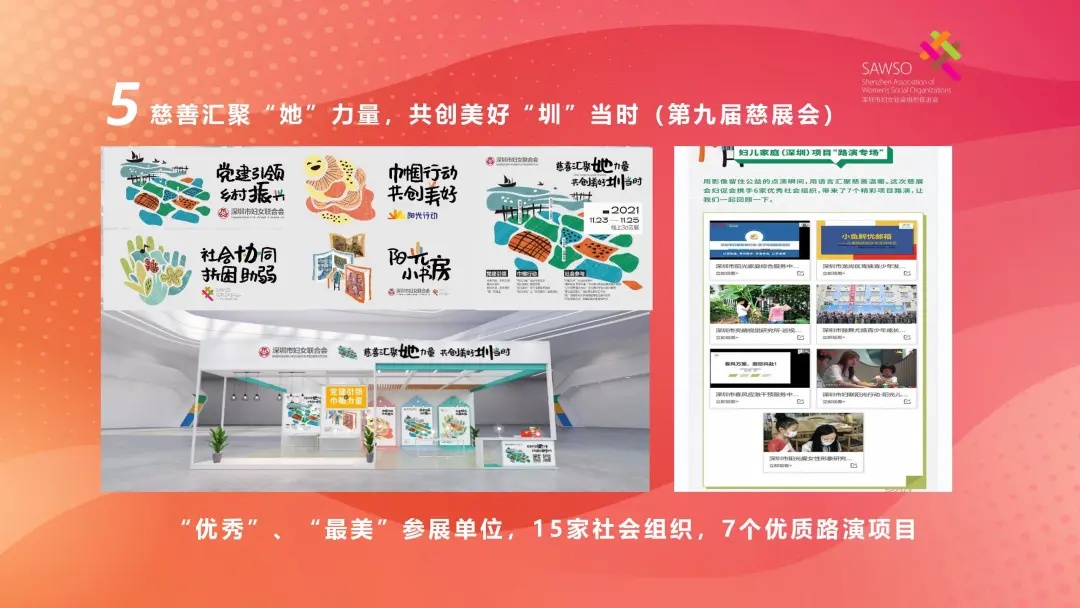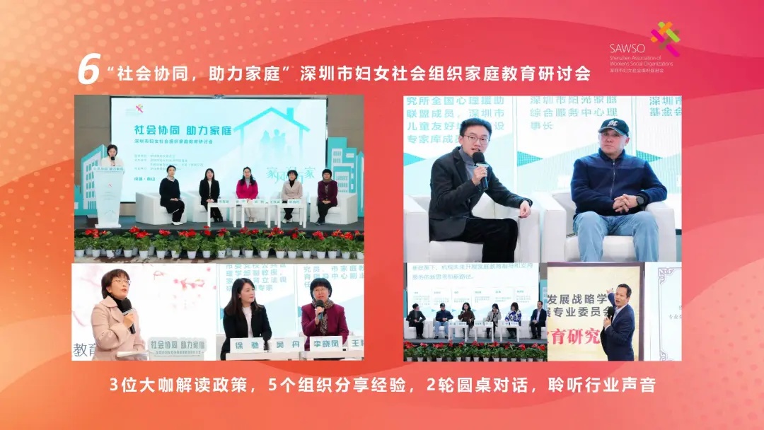 一是成为家风家教工作的重要参与者。去年的“双减”、“三孩”政策以及今年1月1日《家庭教育促进法》的正式实施,让“家事”上升为了“国事”。家庭工作是党中央交办给妇联的任务,也是妇联工作的独特优势,引领全深圳的妇女社会组织共同参与到这项工作中来也是妇联的一项重要工作内容。妇促会要继续发挥平台功能,围绕妇联工作大局,找准深圳家庭工作的“难点”,汇聚行业力量解忧排难,带领妇女社会组织共同“有思考、下功夫、强实践”,做出深圳社会力量参与家庭家教家风建设的成果。